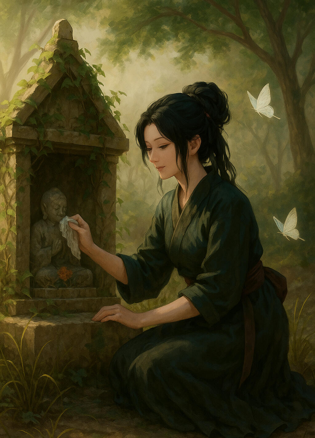 The shrine was half-swallowed by vines, its wooden beams weathered and gray from years of neglect. Natsuki’s sleeves were tied back, her fingers dusted in earth as she knelt before the altar, gently scrubbing moss from a forgotten statue’s face. A child’s laughter broke the stillness, followed by the light patter of footsteps on stone. She glanced over her shoulder to find a small boy crouched near the base of the stairs, watching the pale butterflies that hovered around her like quiet sentries. “They like you,” she said with a soft laugh, beckoning him closer. When he hesitated, she plucked a small, carved talisman from her satchel and held it out. “It is said to lend bravery to the one who carries it,” she explained gently. “You may leave it here with an offering, or keep it for yourself.” The boy grinned, creeping forward to take it. For a moment, she forgot her task, instead humming an old lullaby while he examined the little charm — a tune she hadn’t realized she still remembered.